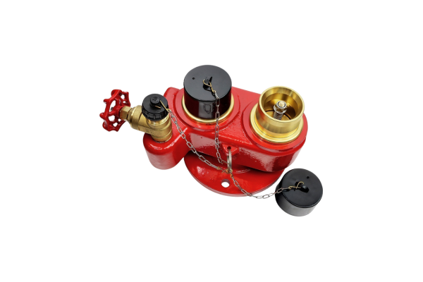 | DN100 × 2-Way Breeching Inlet, rubber blank cap & chrome chain, red painted; Inlet 4×63.5 mm BS336 male instantaneous; built-in bronze non-return valve; outlet 6" PN16 flange; rated 300 psi |